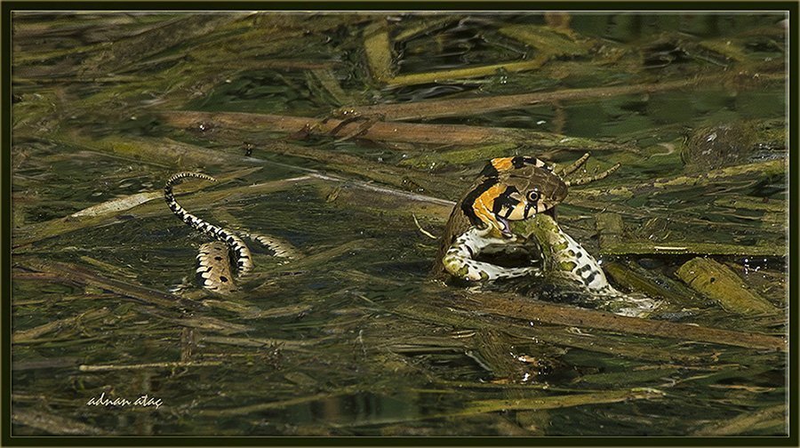 Su yılanı – Natrix tessellata (Ankara 2014) Kurbağa yerken